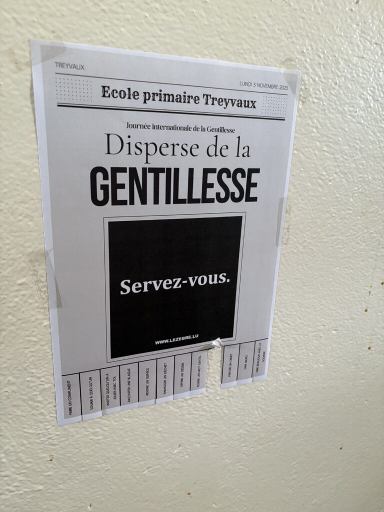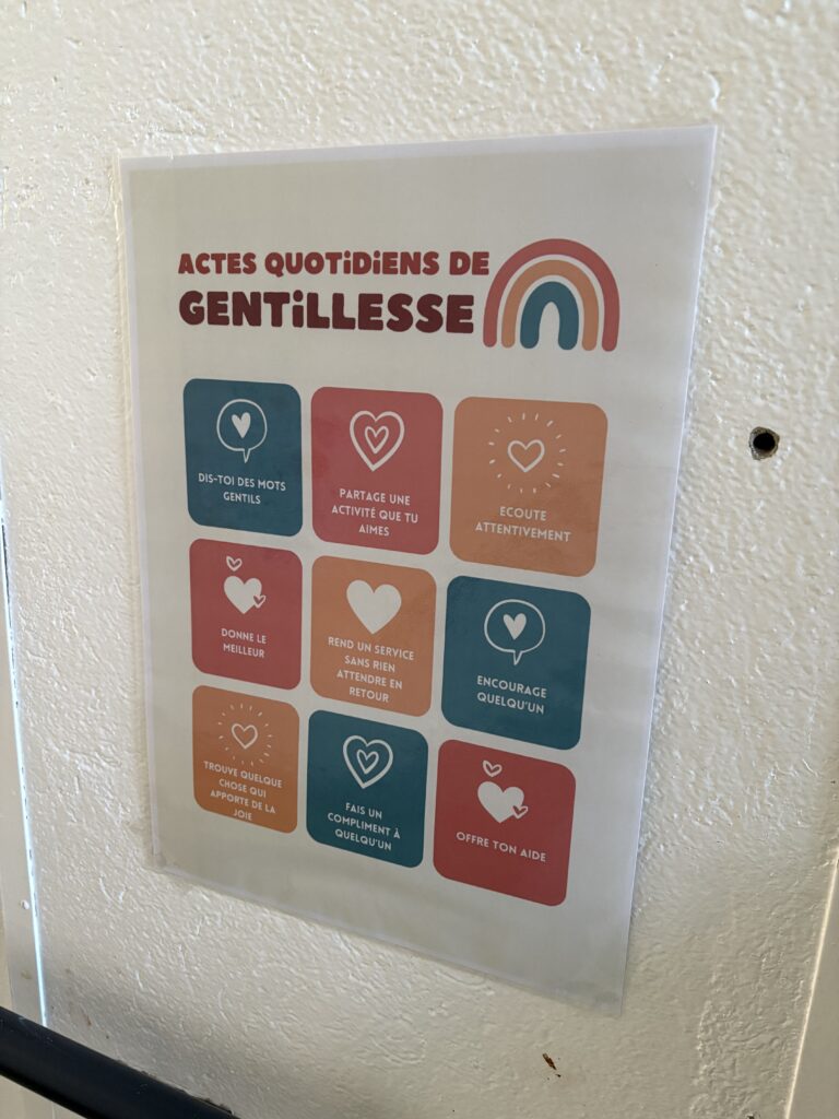 Ce sera ainsi l’occasion pour les élèves de partager des actes de gentillesse gratuits. Des idées ont été disposées dans les bâtiments et les classes pour soutenir les actions des élèves.